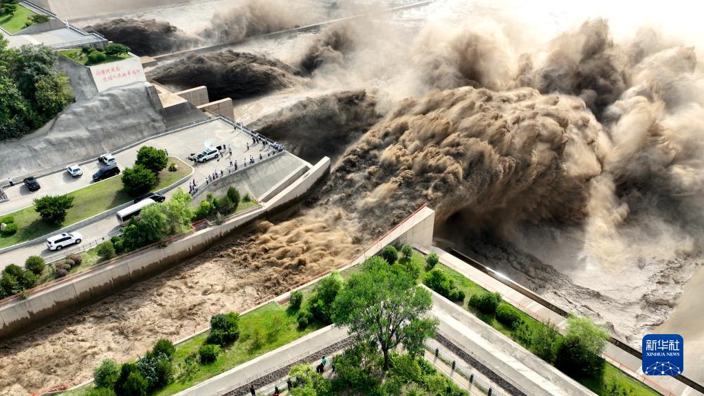 当日,黄河小浪底水库排沙出库,裹挟着大量泥沙的水流从排沙洞奔腾而出,十分壮观,吸引众多游客前来观赏。