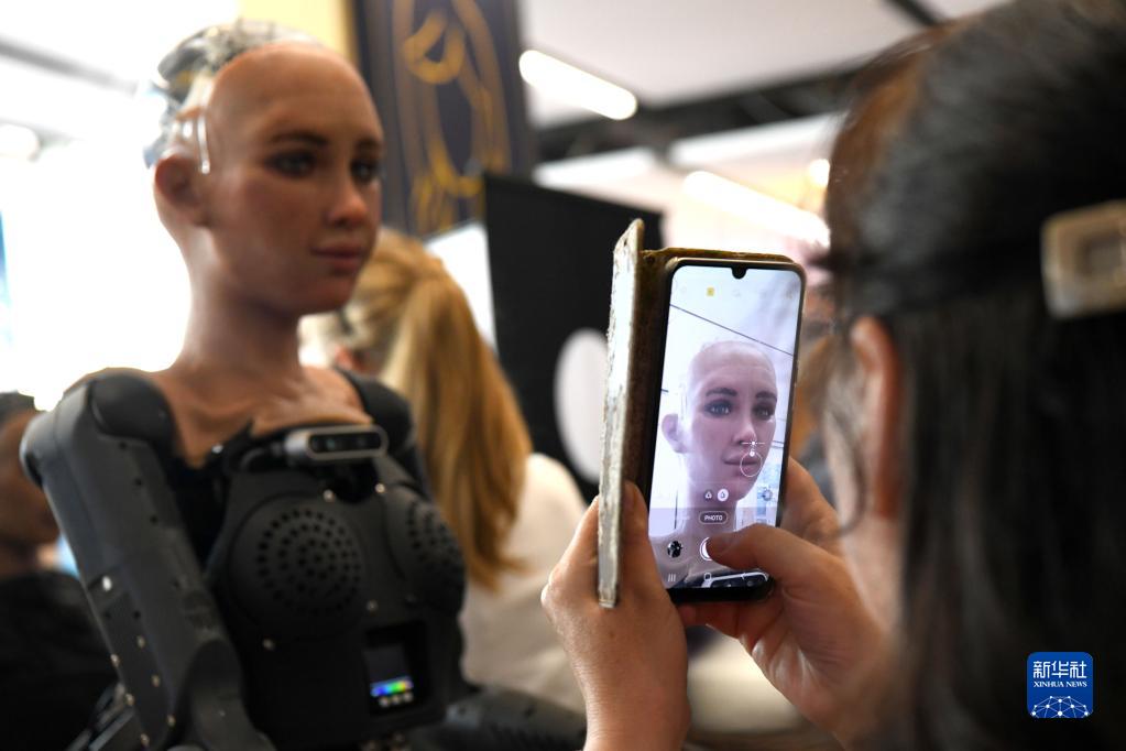 7月7日,在瑞士日内瓦“人工智能造福人类全球峰会”上,一名参会者给仿真机器人索菲亚拍照。