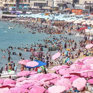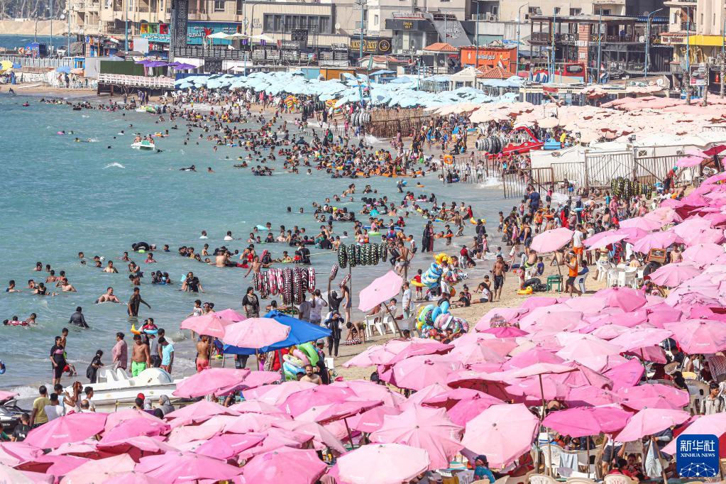 7月6日,人们在埃及亚历山大的海边游玩消暑。