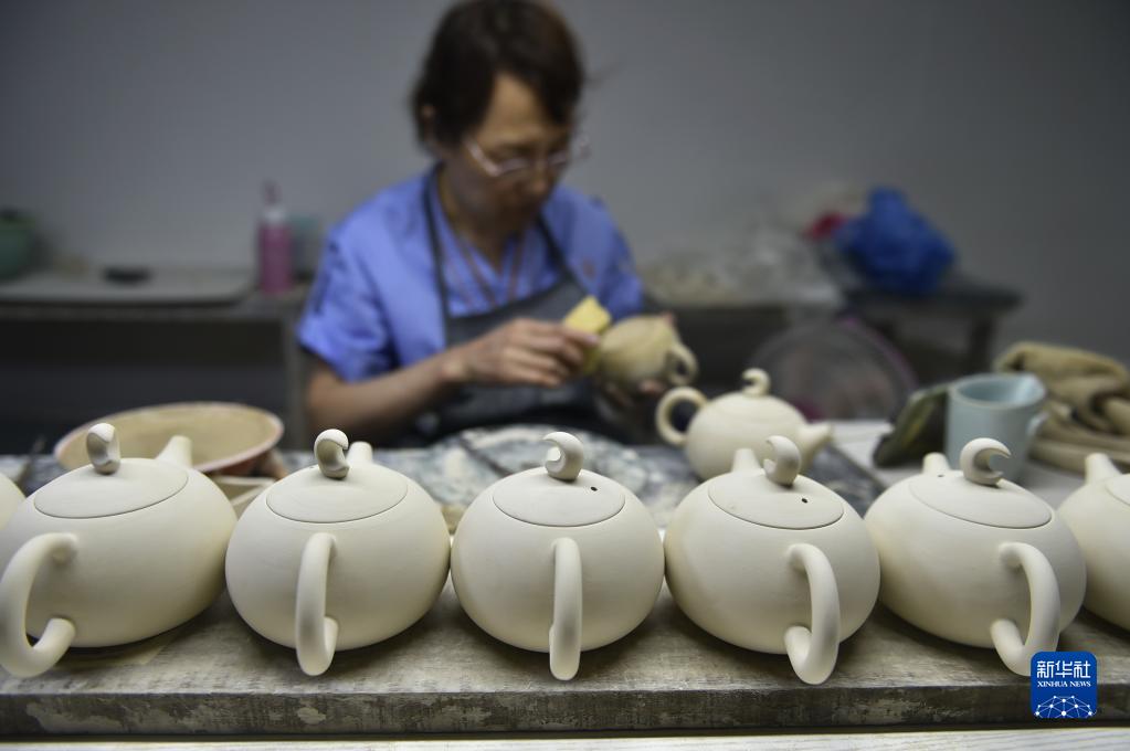 7月6日,工作人员在河南省汝州市玉松汝瓷有限公司的车间里加工汝瓷产品。