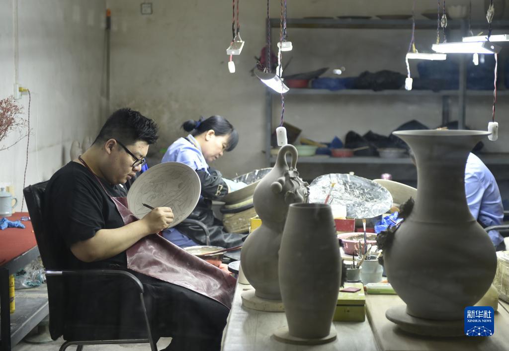 7月6日,工作人员在河南省汝州市玉松汝瓷有限公司的车间里制作汝瓷产品。