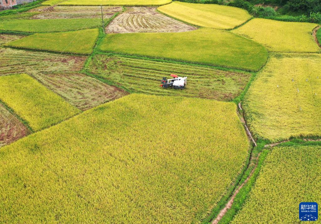 一台收割机在南宁市横州市新福镇抢收早稻(7月7日摄,无人机照片)。