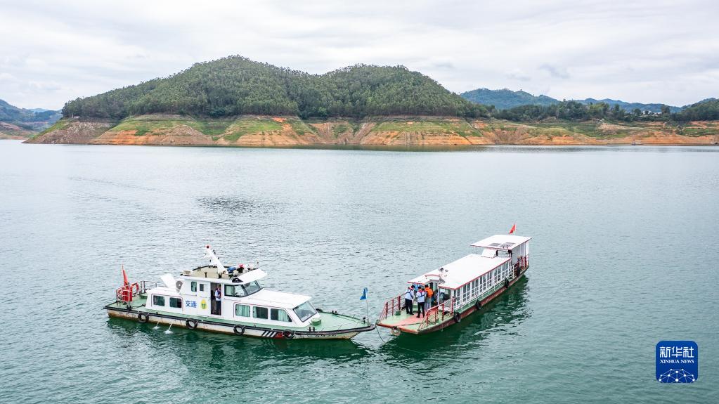 贵州省兴义市交通运输海事中队的工作人员在对万峰湖上的游船进行临停巡检(7月5日摄,无人机照片)。