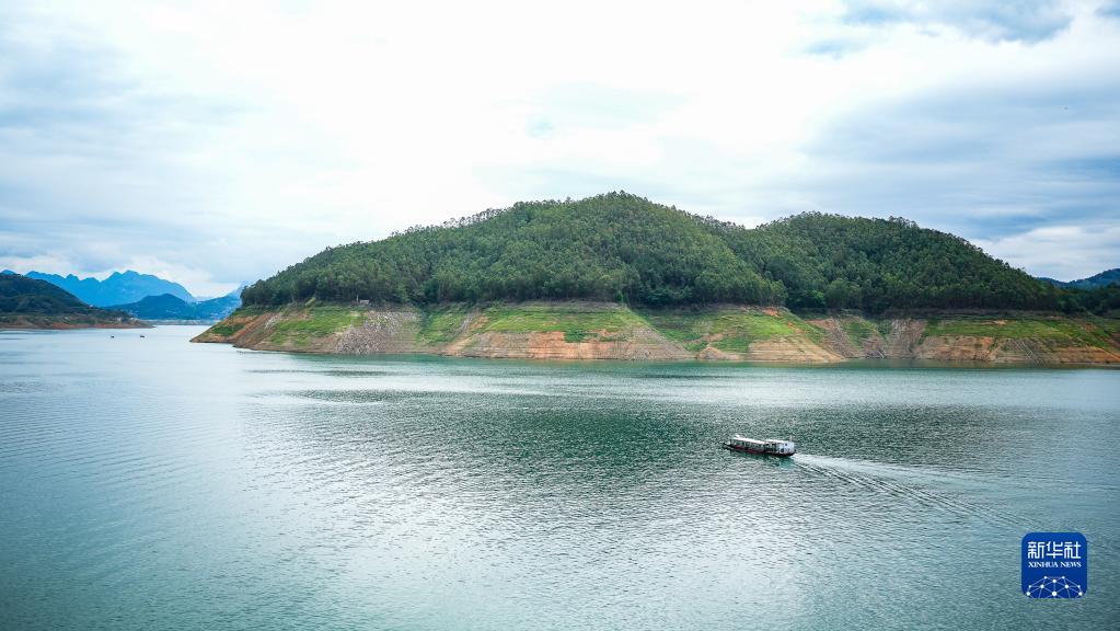 船只行驶在万峰湖南盘江镇水域(7月5日摄)。