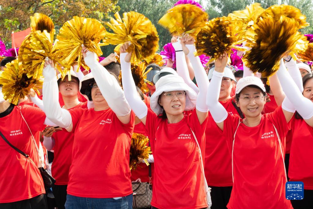 7月8日,在哈尔滨市太阳岛景区太阳石广场,人们庆祝哈尔滨市获得2025年第九届亚洲冬季运动会举办权。