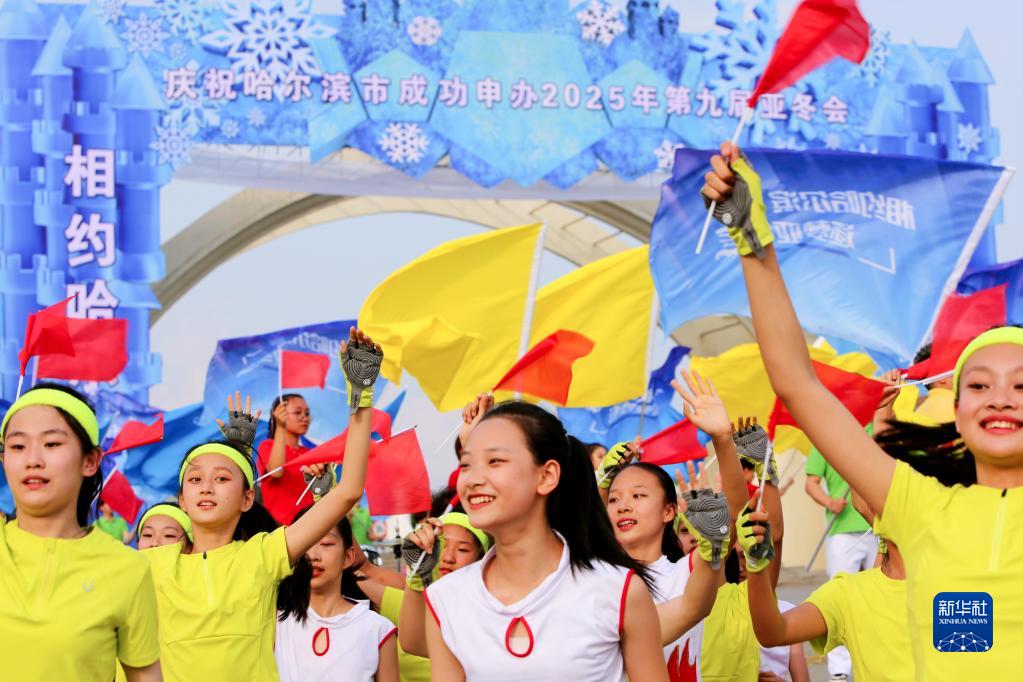 7月8日,在哈尔滨市太阳岛景区太阳石广场,演职人员庆祝哈尔滨市获得2025年第九届亚洲冬季运动会举办权。