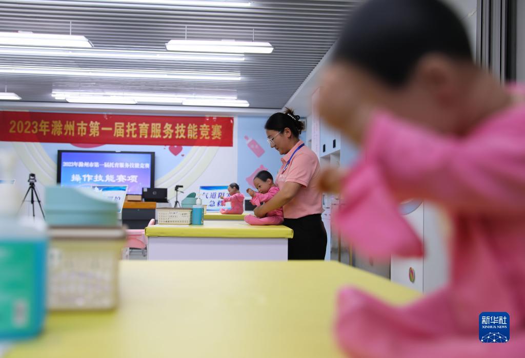 这是7月8日拍摄的托育服务技能竞赛现场。