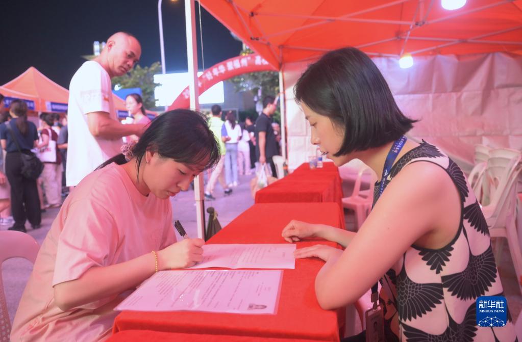 7月8日,一名大学毕业生(左)在“好年华 聚福州”高校毕业生就业夜市现场与企业代表签订就业意向书。