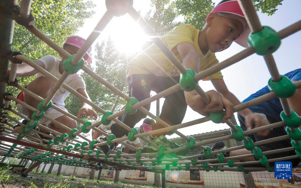 7月8日,参加少年夏令营的孩子在河北省遵化市小厂乡的训练营地进行穿越障碍训练。