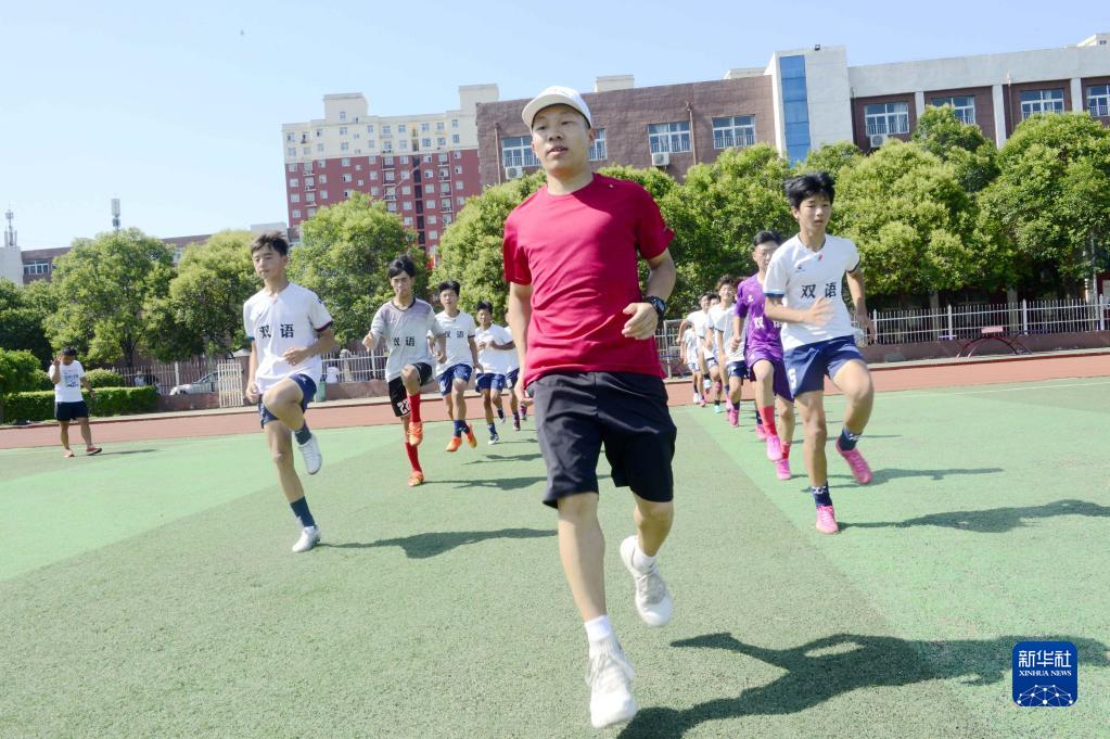 7月8日,在河南省驻马店市汝南县双语学校,来自湖南大学的志愿者带领孩子们一起做运动。
