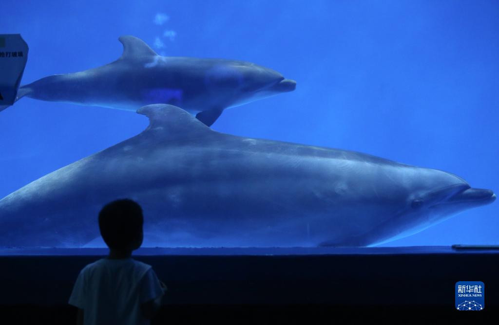 7月8日,一名小朋友在多彩贵州城极地海洋世界观赏宽吻海豚。