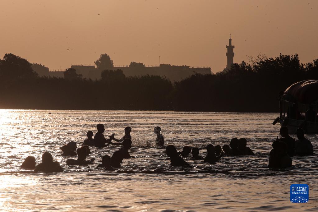 7月8日,在埃及盖卢比尤省,人们在尼罗河里戏水避暑。