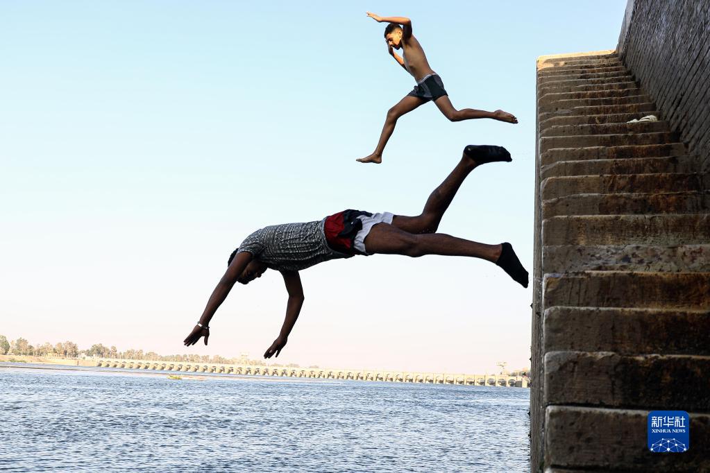 7月8日,在埃及盖卢比尤省,人们跳入尼罗河里戏水避暑。