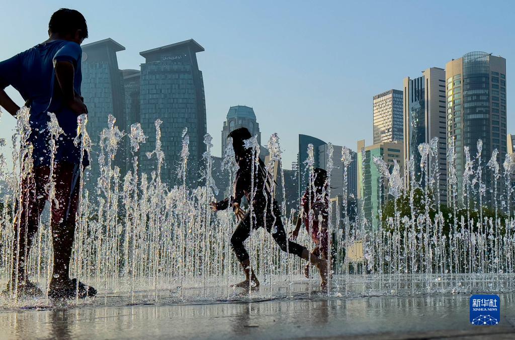 7月6日,在卡塔尔多哈,儿童在喷泉戏水纳凉。
