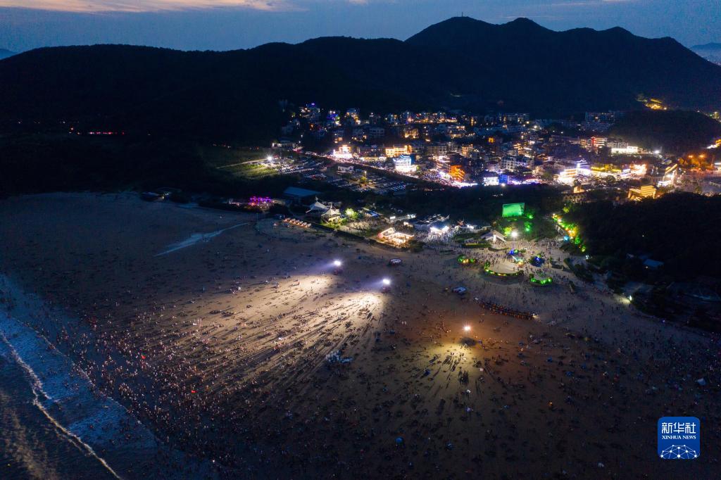 7月8日,夜色中的朱家尖南沙景区(无人机照片)。