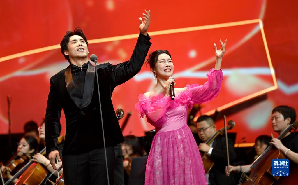 7月8日,在西安“感悟初心⋅与党同行”经典歌曲交响音乐会现场,演唱者洪之光(左)、常思思在演唱歌曲《不忘初心》。