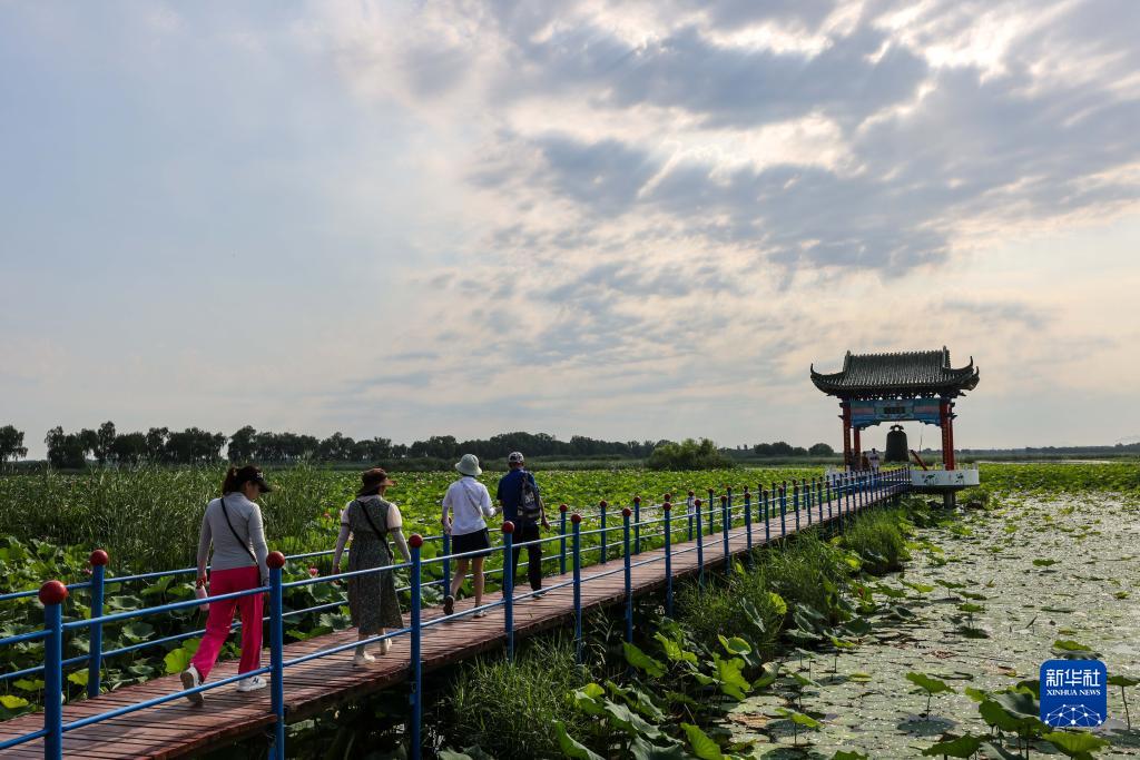 近日,山东省济南市章丘区白云湖国家湿地公园内万亩荷花盛开,让游客在炎炎夏日中感受水清岸绿、荷叶田田的生态美景。近年来,章丘区白云湖街道依托白云湖国家湿地公园建设,先后开展退渔还湿、湖库清淤、湖库联通、环湖大堤改造等生态提升工程,湿地生态系统和功能得到修复。