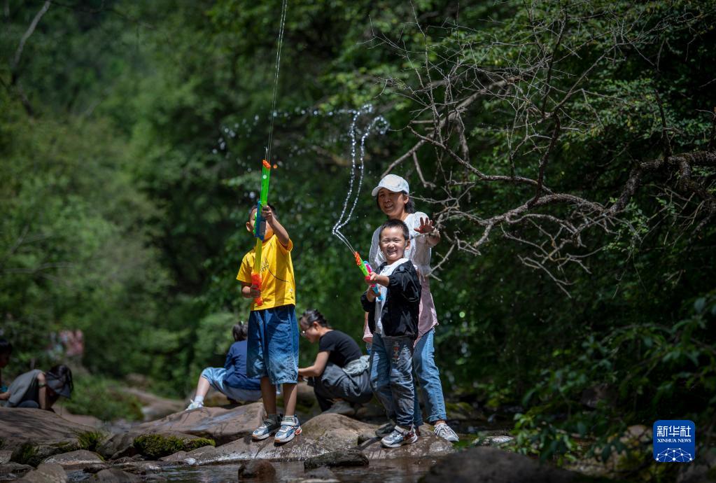 7月8日,家长带着孩子在六盘山国家森林公园玩耍。