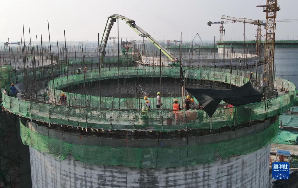 7月8日,工人在粮食安全应急储备及食品深加工全链化综合生产基地项目建设工地施工(无人机照片)。