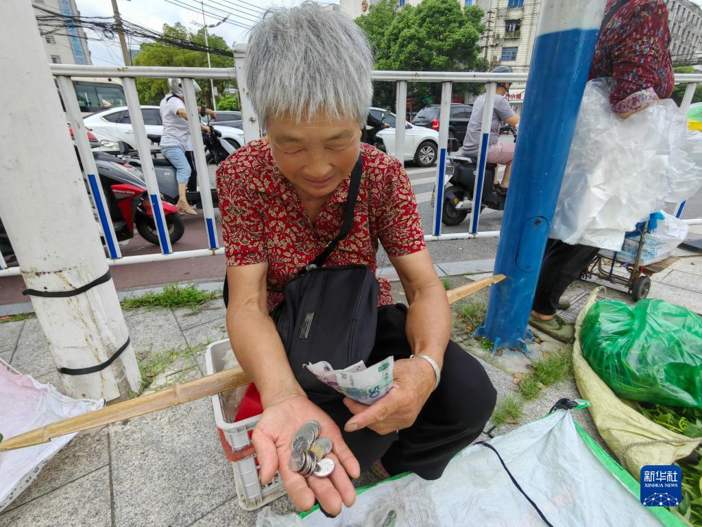在江西南昌县城区某菜市场附近,菜农余春兰在点算今天的收益(7月5日摄)。