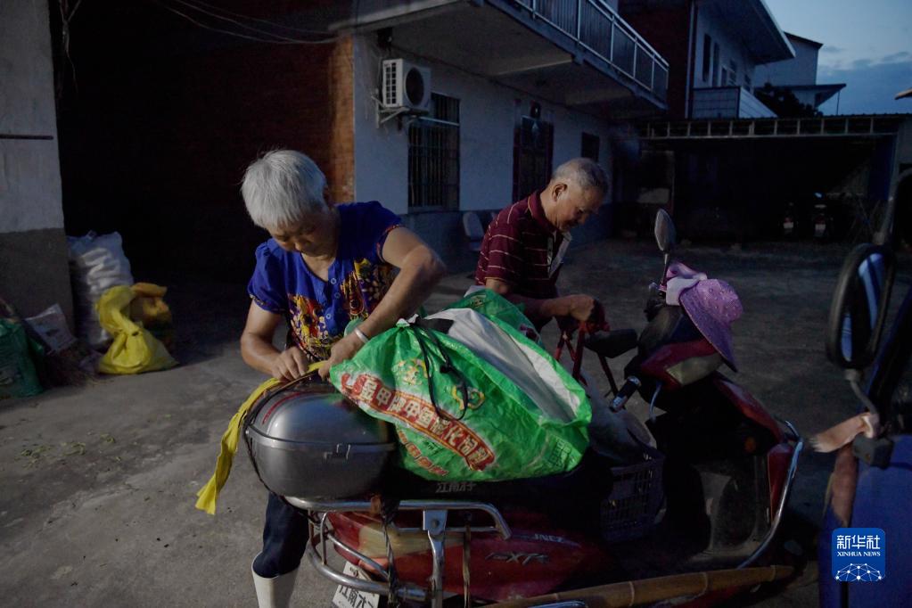 凌晨5时,在江西南昌县向塘镇浃溪村,菜农余春兰(左)将整理好的蔬菜固定在摩托车上准备骑车去赶公交车(7月5日摄)。