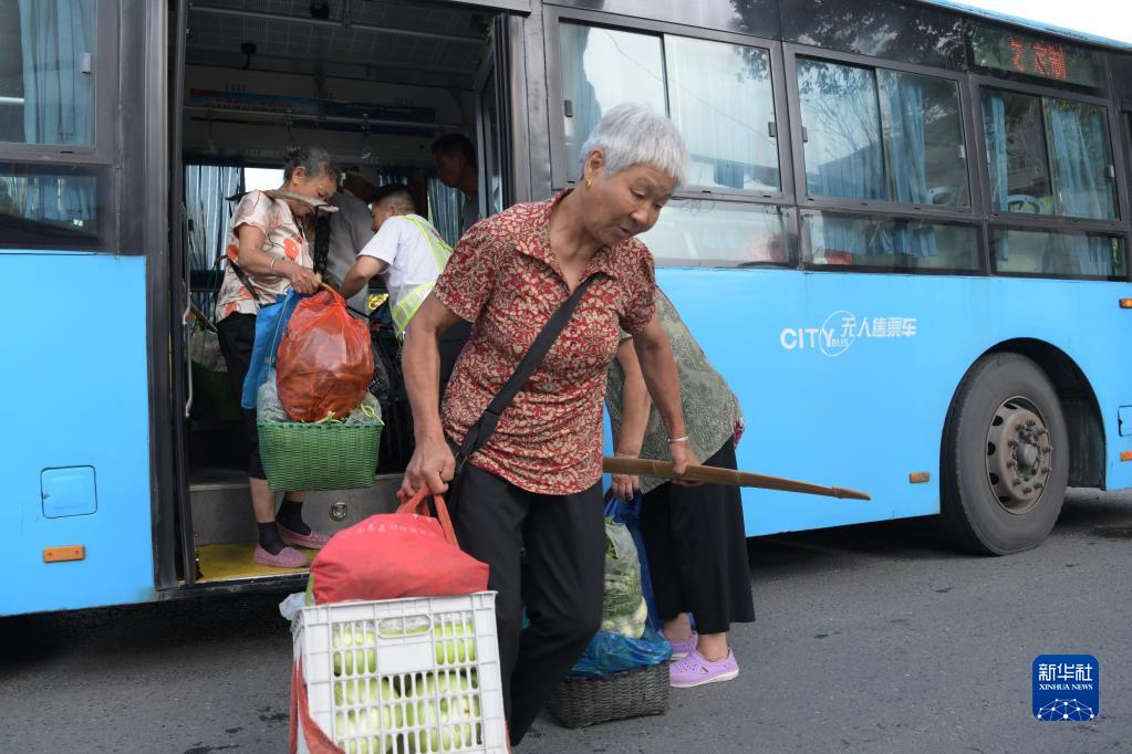 菜农余春兰到站下车,准备前去卖菜(7月5日摄)。