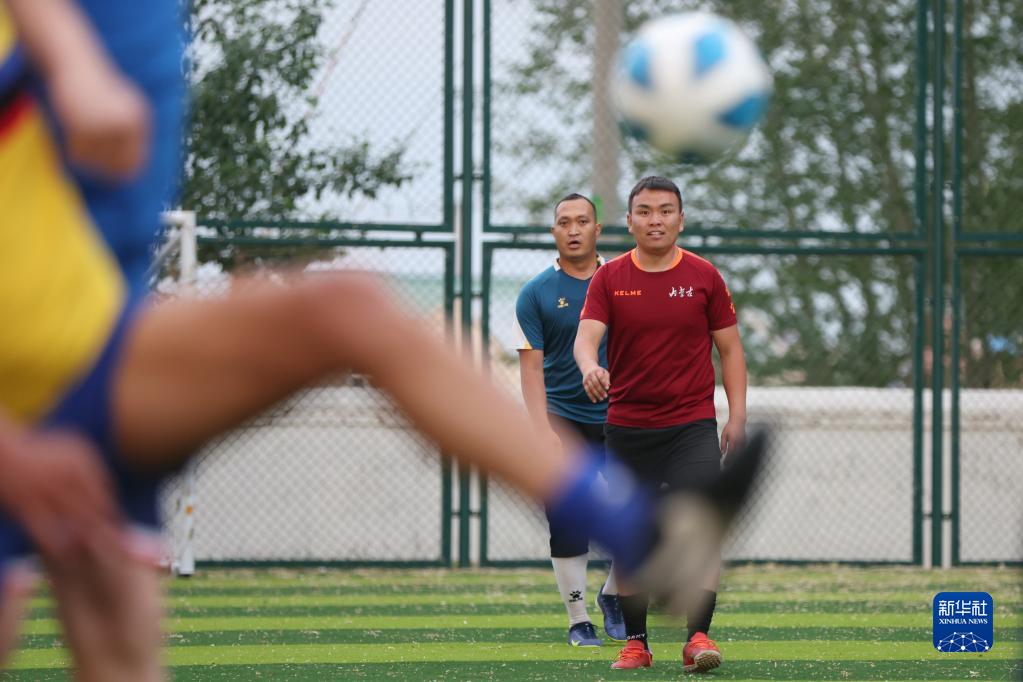 6月26日,巴达玛斯仁(右)和队友们一起踢球。