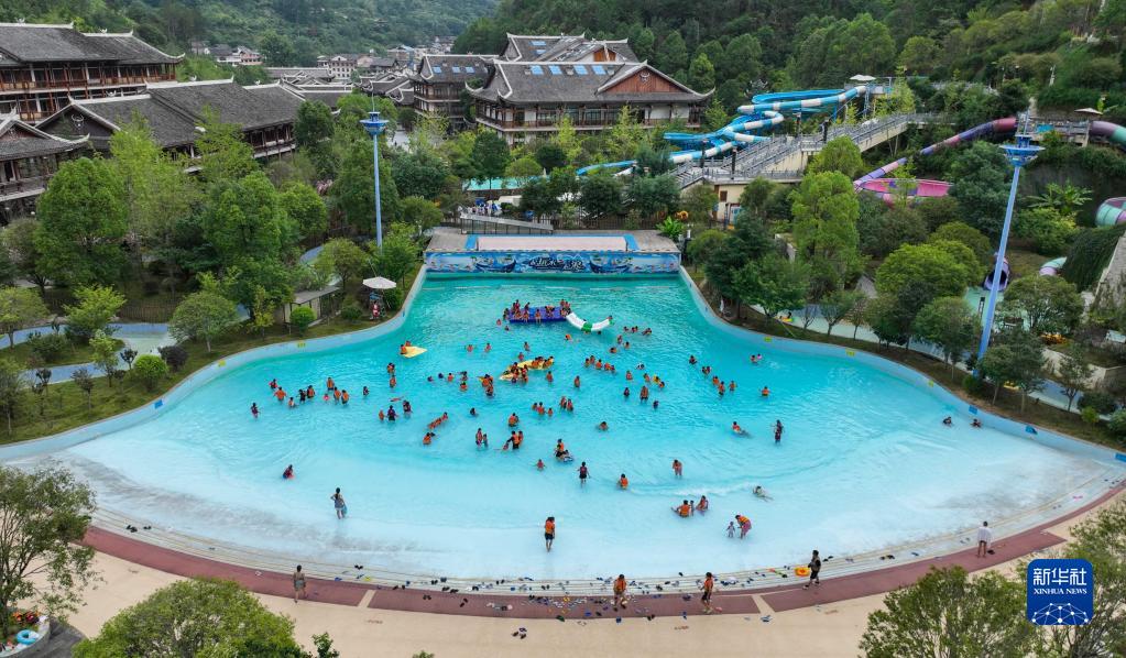 7月8日,在贵州省剑河县温泉小镇,游客在戏水消暑(无人机照片)。