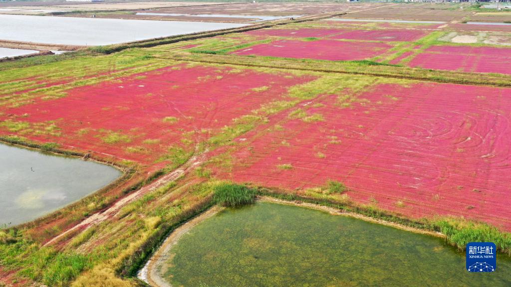 盛夏时节,江苏省连云港市灌云县燕尾港沿海滩涂湿地大片野生盐蒿渐红,如一片片红毯铺在大地上。