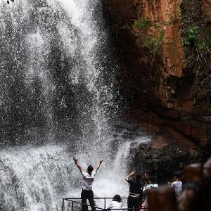 7月9日,游客在新密市伏羲山大峡谷内游玩。