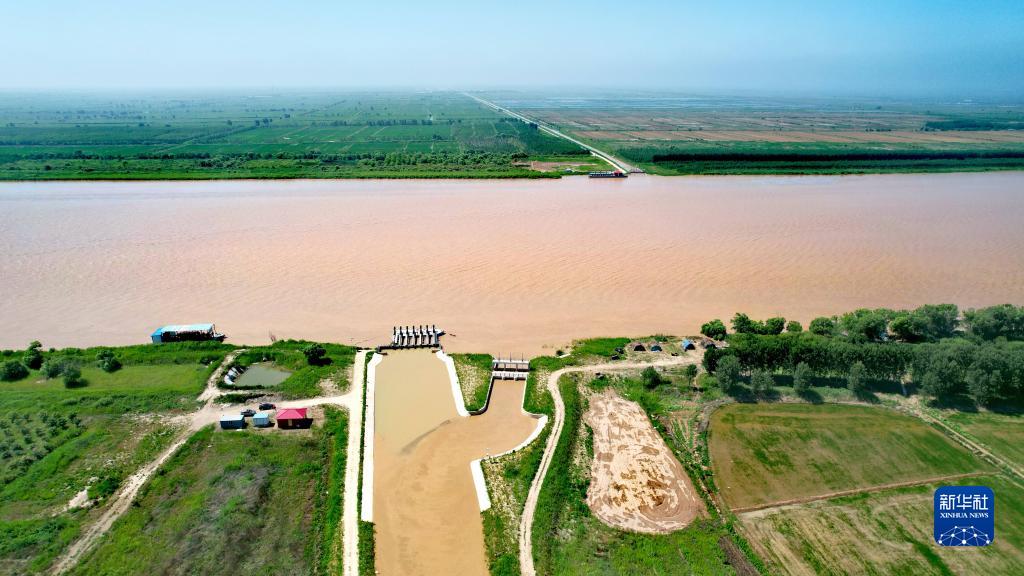黄河三角洲国家级自然保护区黄河口4号引水闸(下)及引水渠(无人机照片,2023年6月30日摄)。