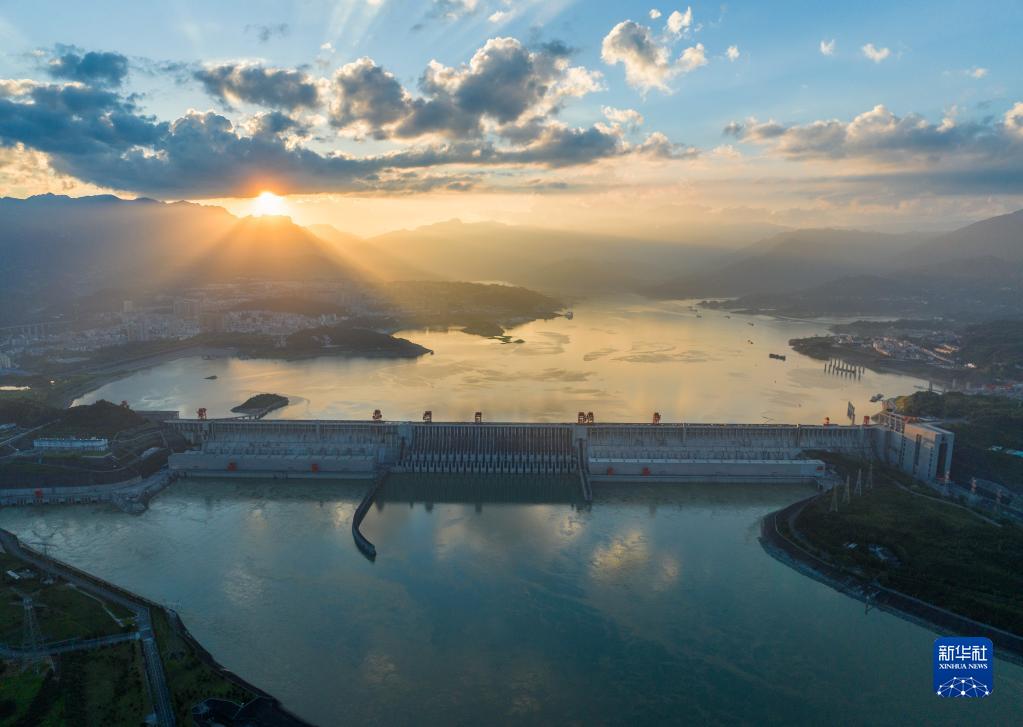 这是7月9日在湖北省宜昌市拍摄的夕阳映照下的三峡水利枢纽工程(无人机照片)。