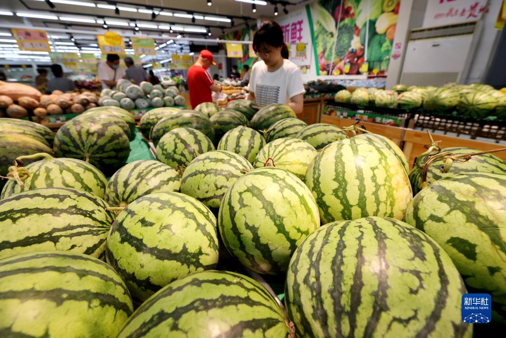 7月10日,顾客在山东省枣庄市龙山路街道一家超市选购西瓜。