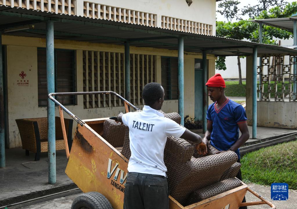 6月21日,在位于布隆迪经济首都布琼布拉的卡蒙盖手工业培训中心,学员将制作好的竹藤产品装车。