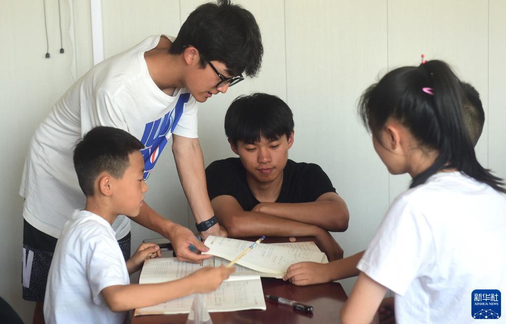 7月10日,在河北沧州,两名大中专学生志愿者为董林村学生辅导作业。