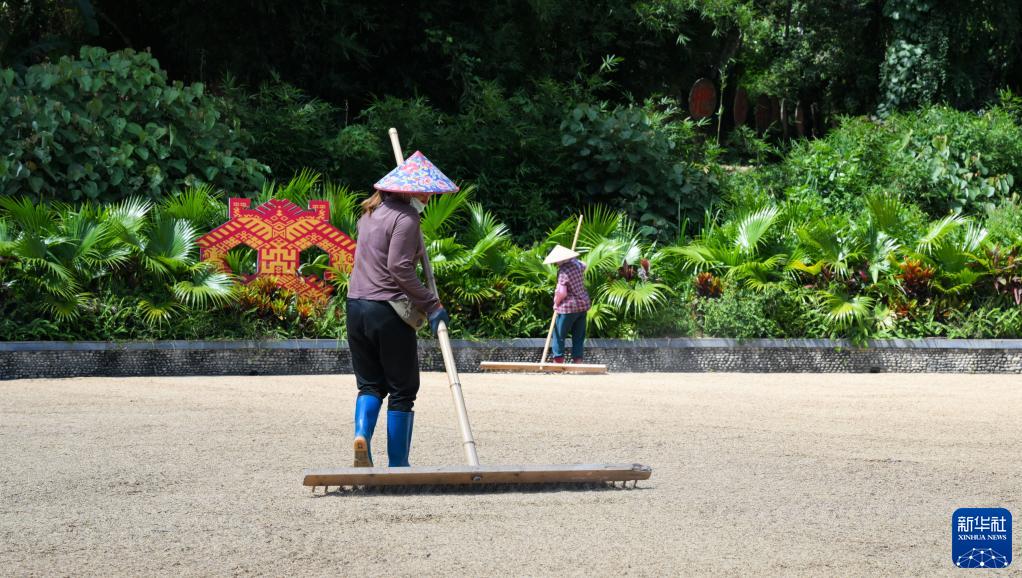 三伏将至,海南省五指山市水满乡毛纳村村民抢抓农时晾晒稻谷,田间地头一派繁忙。