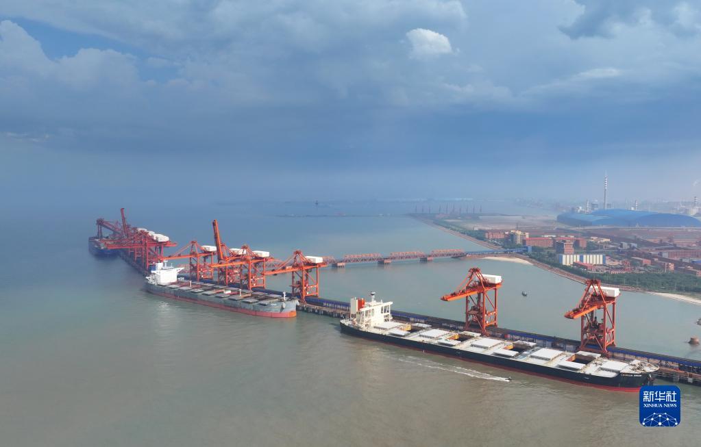 7月10日,多艘轮船靠泊在唐山港曹妃甸港区矿石码头卸载(无人机照片)。