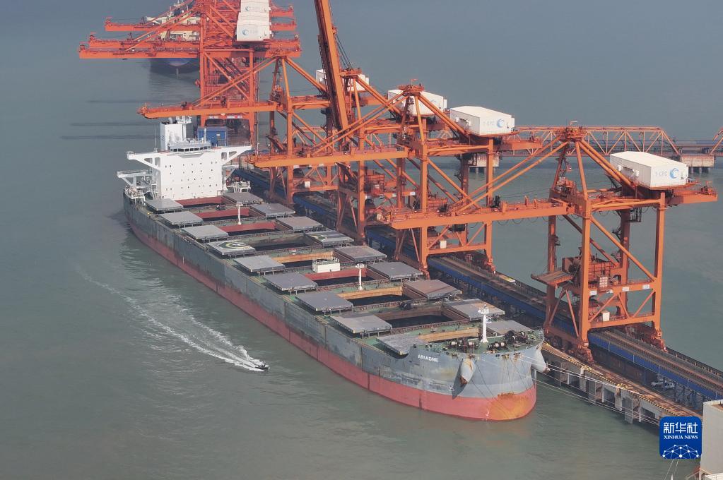 7月10日,一艘轮船靠泊在唐山港曹妃甸港区矿石码头卸载(无人机照片)。
