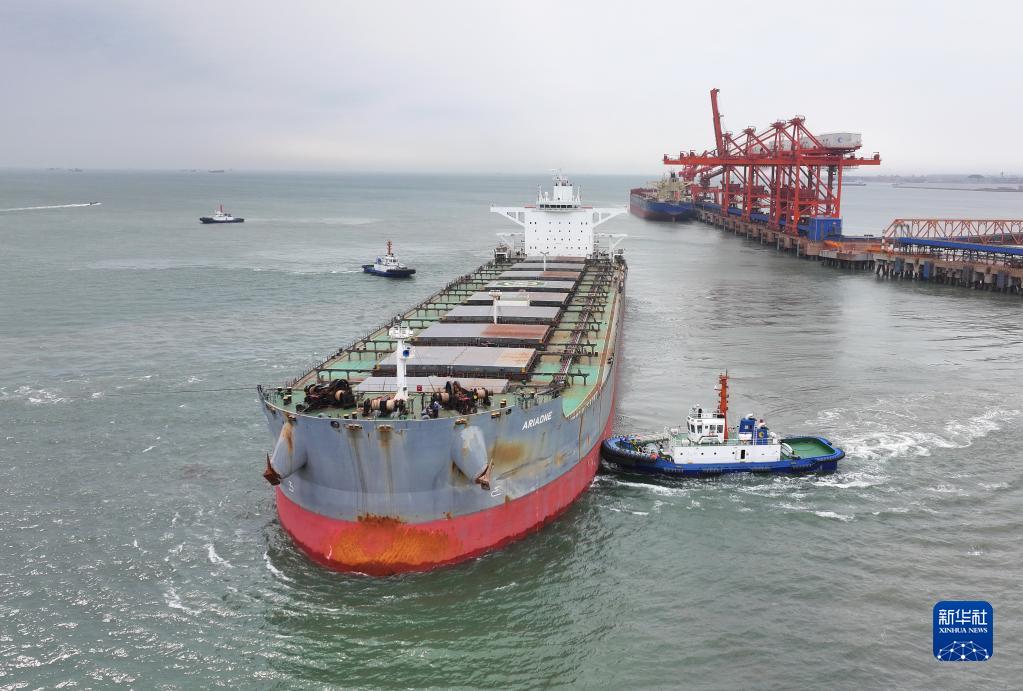 7月10日,一艘轮船在唐山港曹妃甸港区矿石码头卸载后在拖轮协助下离港(无人机照片)。