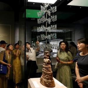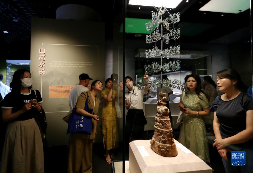 7月10日,参观者在东汉摇钱树展柜前驻足观看。