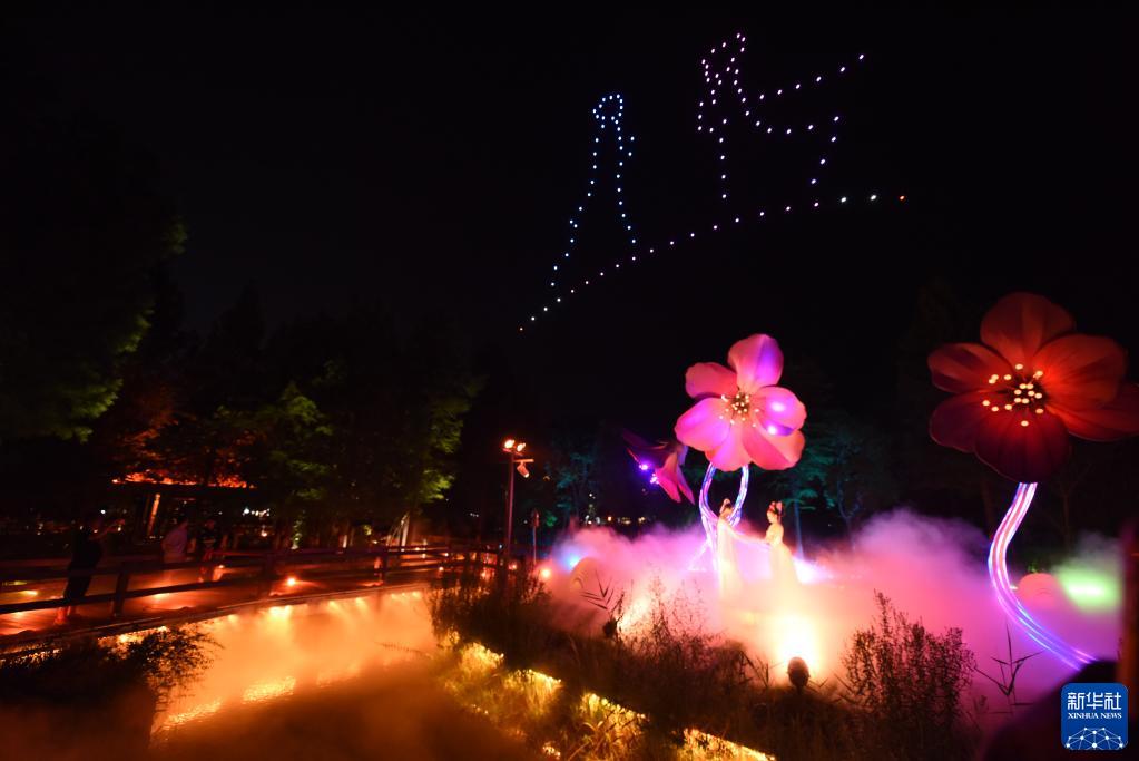 7月9日,在江苏东台西溪天仙缘景区,观众在观看行进式夜间游园演出《寻仙缘》。