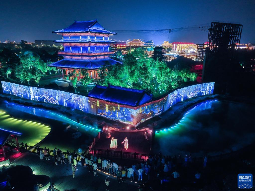 7月9日,在江苏东台西溪天仙缘景区,观众在观看行进式夜间游园演出《寻仙缘》(无人机照片)。