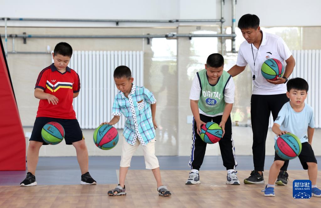 7月10日,在河北省石家庄市复兴大街小学,小学生在老师的指导下练习篮球基本功。