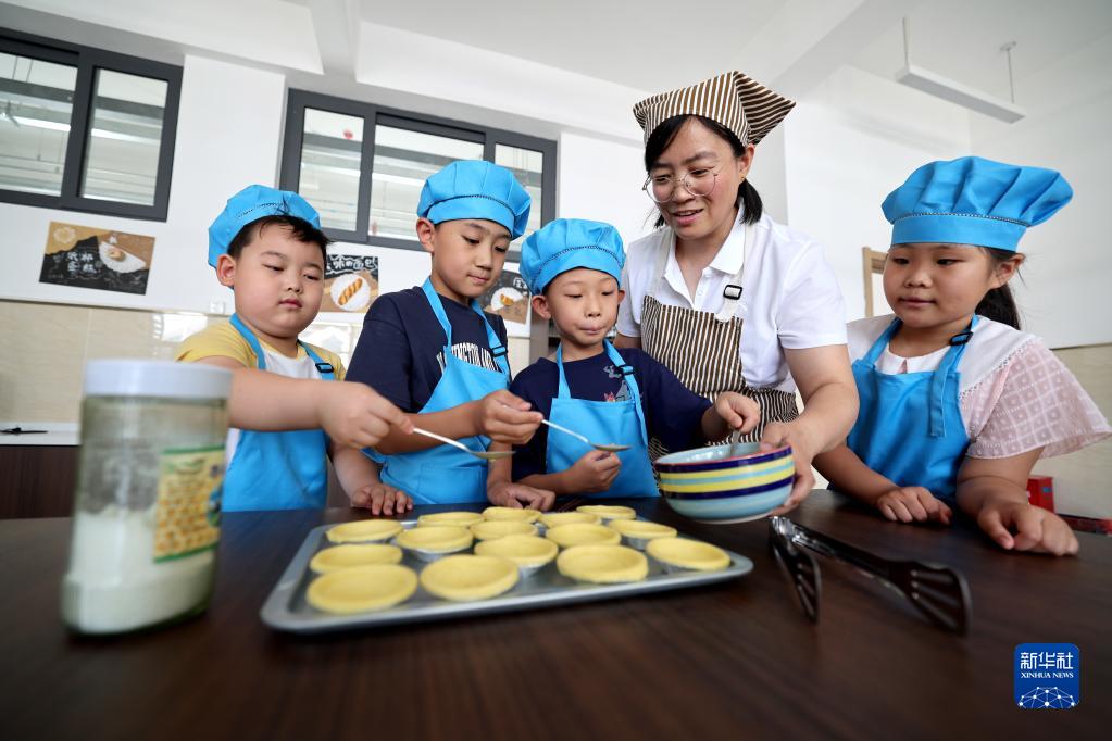 7月10日,在河北省石家庄市复兴大街小学,小学生在老师的指导下进行面点制作。