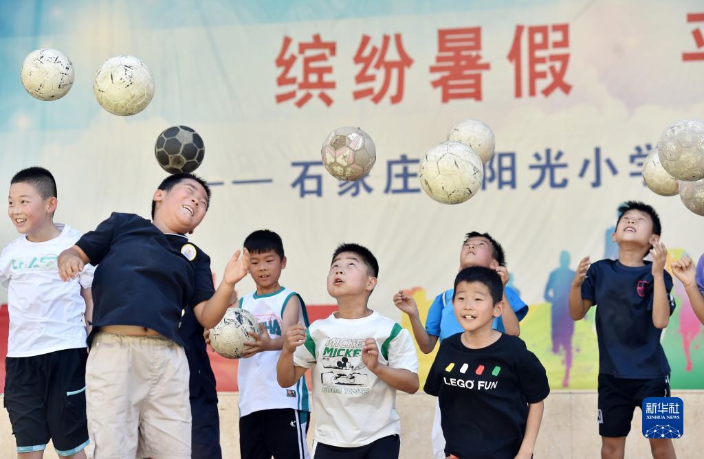 7月10日,在石家庄市阳光小学,学生进行足球训练。