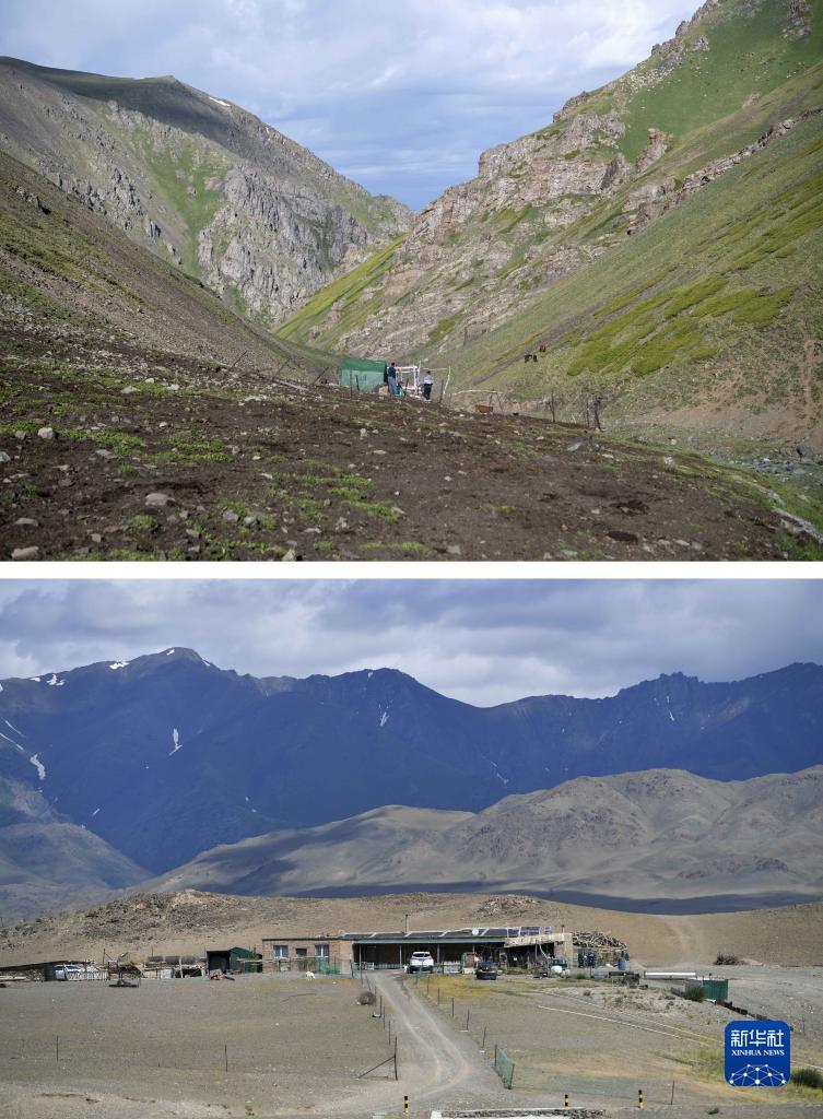 拼版照片:上图为牧民哈布得拉什么在高山夏季牧场居住的帐篷搭建于巴尔鲁克山深处(7月5日摄);下图为哈布得拉什么一家在巴尔鲁克山脚下常年居住的房子(7月6日摄)。