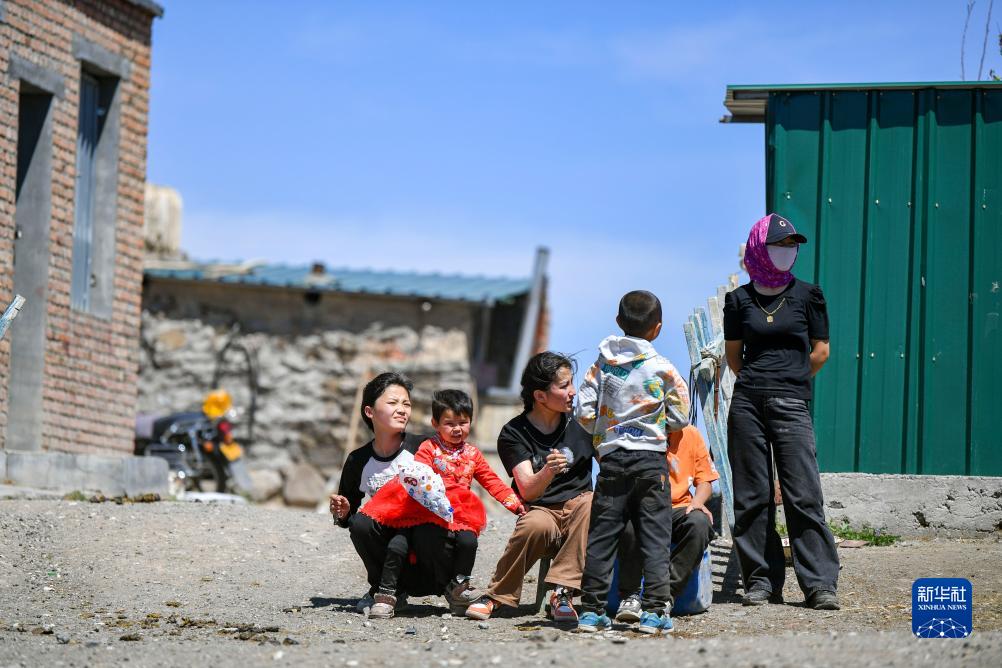 哈布得拉什么赶着羊群离家后,他的大女儿加孜拉(右一)、小女儿昆树阿克(左三)和侄女(左一)、孙辈们齐齐望着转场人群远去的方向(7月3日摄)。