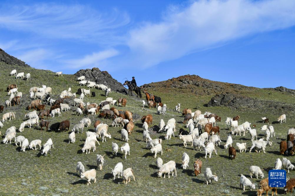 哈布得拉什么赶着羊群在转场牧道上行进(7月3日摄)。