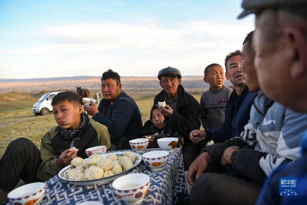 转场队伍抵达第一天的露宿营地后,哈布得拉什么(左三)和亲人们一起席地而坐吃晚饭(7月3日摄)。