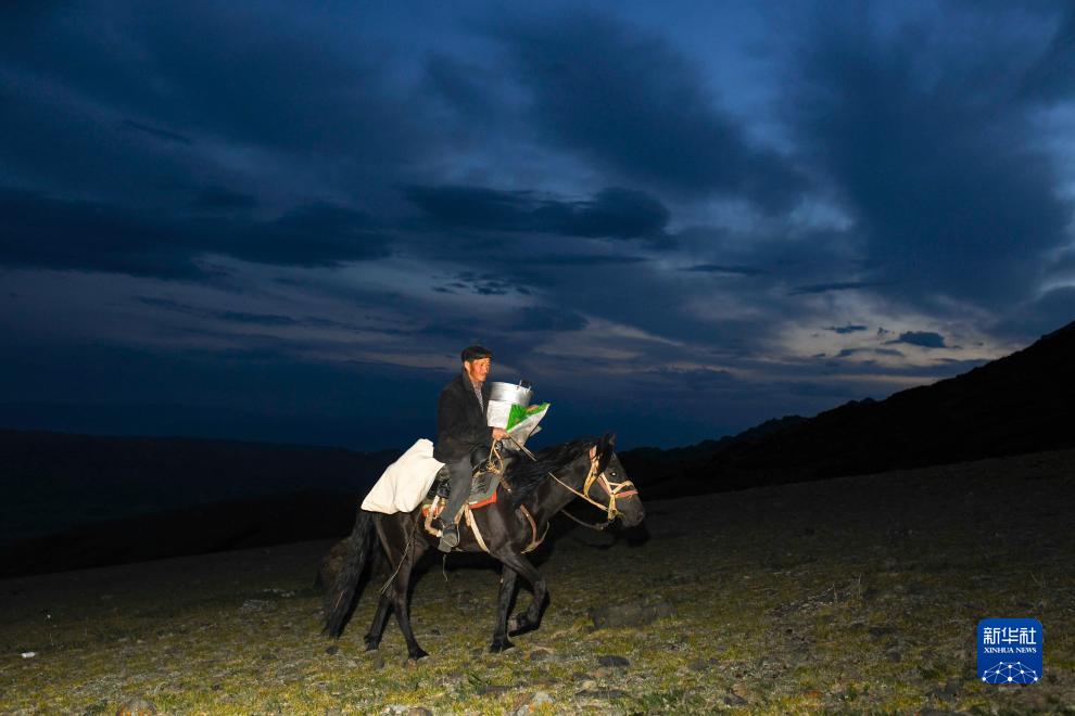 由于坡度太大,汽车无法携带物品抵达露宿营地,哈布得拉什么只好骑马转运(7月3日摄)。